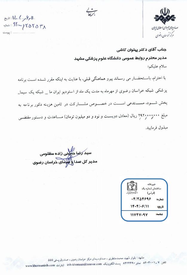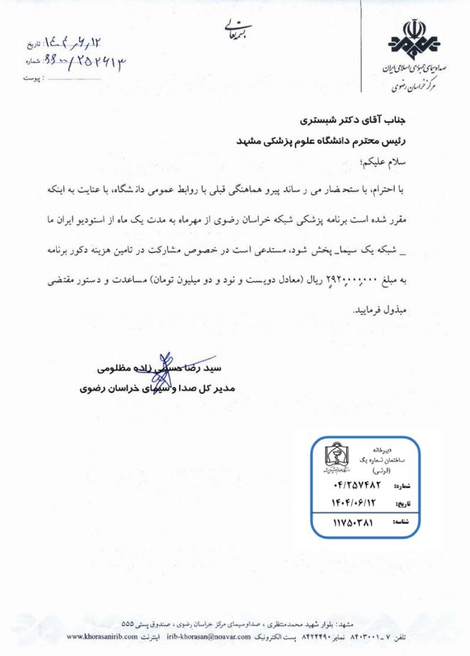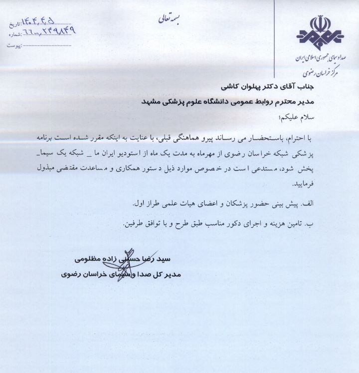 بازدید هیات رئیسه دانشگاه علوم پزشکی مشهد از صداوسیمای مرکز خراسان رضوی و جلسه مشترک با مدیرکل و معاونین صداوسیما و توافق برای مشارکت دانشگاه در برنامه ایران ما مکاتبات برای این برنامه