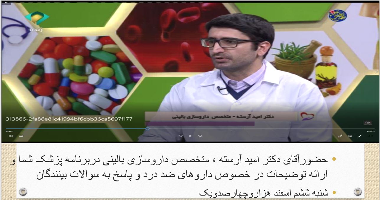 آرشیو انعکاس روزانه دانشگاه در رسانه ها پزشک شما 06 اسفند 1401 بازدید: 145 امتیاز: ( 0 Rating ) داروهای ضد درد امتیاز کاربران لطفا رای دهید رای 1 رای 2 رای 3 رای 4 رای 5 موضوع برنامه : داروهای ضد درد کارشناس برنامه : آقای دکتر امید آرسته ، متخصص داروسازی بالینی کاری از : روابط عمومی دانشگاه علوم پزشکی مشهد قبلی بعدی