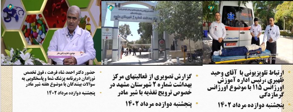 آرشیو انعکاس روزانه دانشگاه در رسانه ها پزشک شما 12 مرداد 1402 بازدید: 116 امتیاز: ( 0 Rating ) اهمیت تغذیه با شیر مادر دکتر احمدشاه فرهت امتیاز کاربران لطفا رای دهید رای 1 رای 2 رای 3 رای 4 رای 5 موضوع برنامه : اهمیت تغذیه با شیر مادر کارشناس برنامه : حضور دکتر احمدشاه فرهت ، فوق تخصص نوزادان ارتباط زنده : ارتباط تلویزیونی با آقای وحید ظهیری ،رئیس اداره آموزش اورژانس 115 با موضوع اورژانس گرمازدگی کاری از : روابط عمومی دانشگاه علوم پزشکی مشهد لینک تلوبیون قبلی بعدی