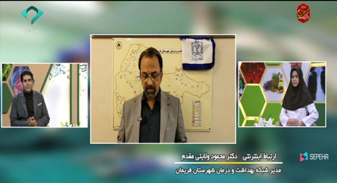 ارتباط زنده تلویزیونی با دکتر محمود ولایتی مقدم ، مدیر شبکه بهداشت ودرمان فریمان با موضوع افتتاح مرکز خدمات جامع سلامت روستایی احمد آباد