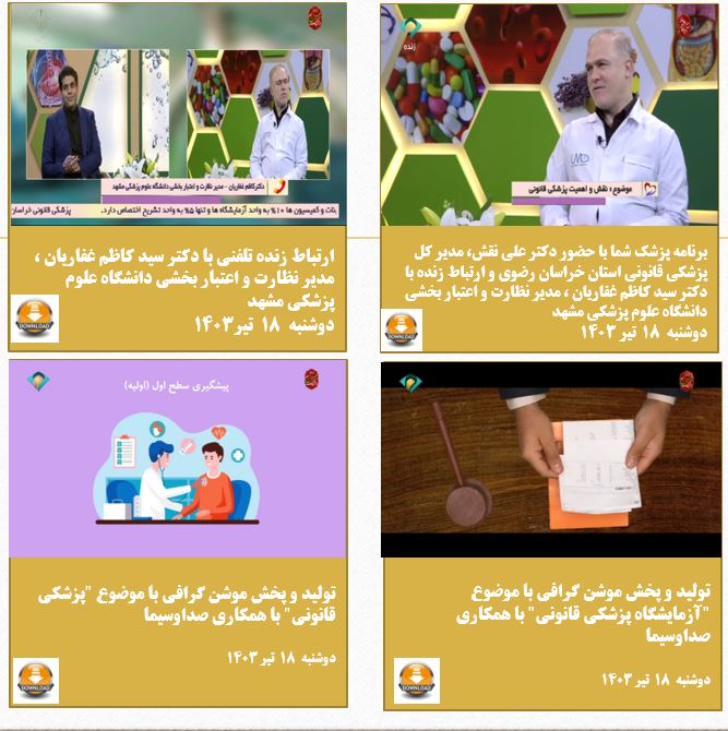 برنامه پزشک شما با حضور دکتر علی نقش، مدیر کل پزشکی قانونی استان خراسان رضوی و ارتباط زنده با دکتر سید کاظم غفاریان ، مدیر نظارت و اعتبار بخشی دانشگاه علوم پزشکی مشهد