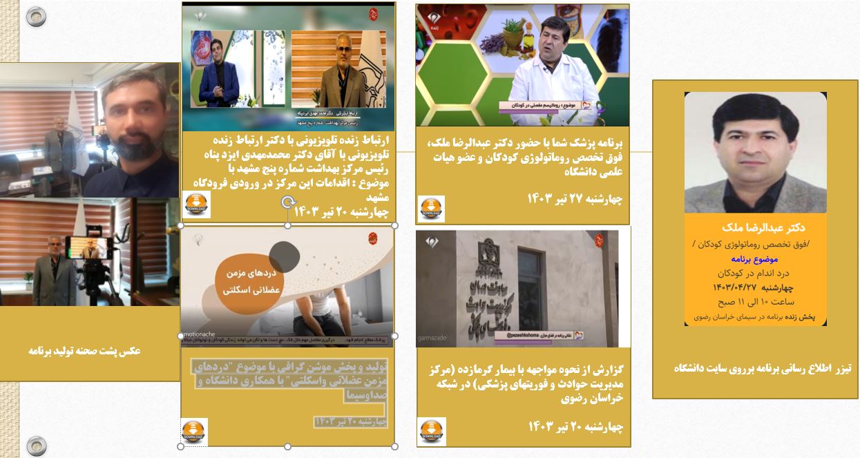 برنامه پزشک شما با حضور دکتر عبدالرضا ملک ، فوق تخصص روماتولوژی کودکان با موضوع درد اندام در کودکان و ارتباط زنده تلویزیونی با آقای دکتر محمدمهدی ایزد پناه رئیس مرکز بهداشت شماره پنج مشهد با موضوع : اقدامات این مرکز در ورودی فرودگاه مشهد چهارشنبه ۲۷ تیر ۱