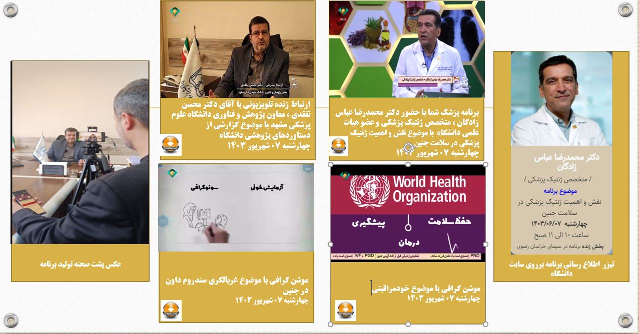 برنامه پزشک شما با حضور دکتر محمدرضا عباس زادگان ، متخصص ژنتیک پزشکی و عضو هیات علمی دانشگاه با موضوع نقش و اهمیت ژنتیک پزشکی در سلامت جنین و ارتباط زنده تلویزیونی با آقای دکتر محسن تفقدی ، معاون پژوهش و فناوری دانشگاه علوم پزشکی مشهد با موضوع گزارشی از د