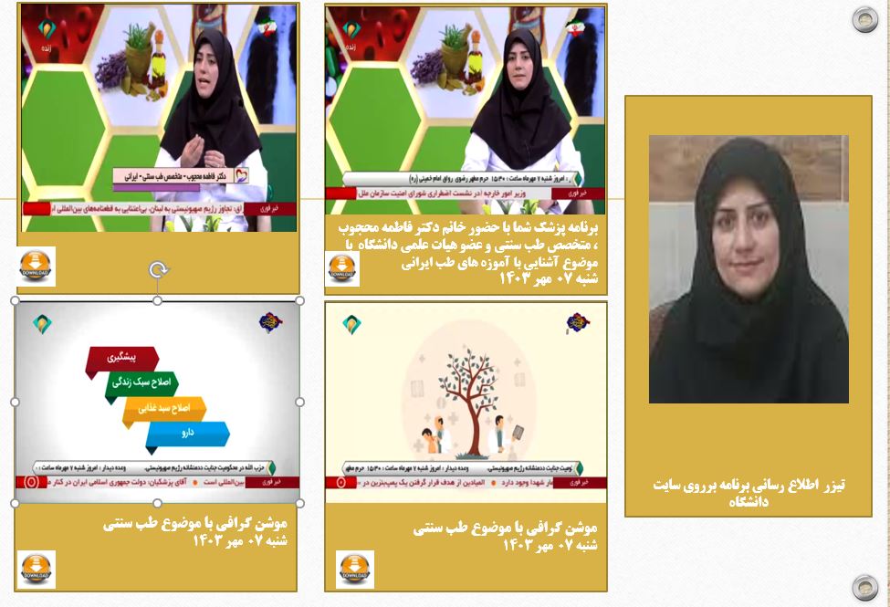 آرشیو انعکاس روزانه دانشگاه در رسانه ها پزشک شما 07 مهر 1403 بازدید: 136 امتیاز: ( 0 Rating ) برنامه پزشک شما با حضور خانم دکتر فاطمه محجوب ، متخصص طب سنتی و عضو هیات علمی دانشگاه با موضوع آشنایی با آموزه های طب ایرانی شنبه 07 مهر 1403 امتیاز کاربران لطفا رای دهید رای 1 رای 2 رای 3 رای 4 رای 5 تماشای برنامه در تلوبیون موضوع برنامه : برنامه پزشک شما با حضور خانم دکتر فاطمه محجوب ، متخصص طب سنتی و عضو هیات علمی دانشگاه با موضوع آشنایی با آموزه های طب ایرانی شنبه 07 مهر 1403 ارتباط زنده : موشن گرافی با موضوع طب سنتی شنبه 07 مهر 1403 گزارش 1 : موشن گرافی با موضوع طب سنتی شنبه 07 مهر 1403 کاری از : روابط عمومی دانشگاه علوم پزشکی مشهد با همکاری صداوسیمای مرکز خراسان رضوی موشن گرافی با موضوع طب سنتی شنبه 07 مهر 1403 موشن گرافی با موضوع طب سنتیشنبه 07 مهر 1403 قبلی بعدی