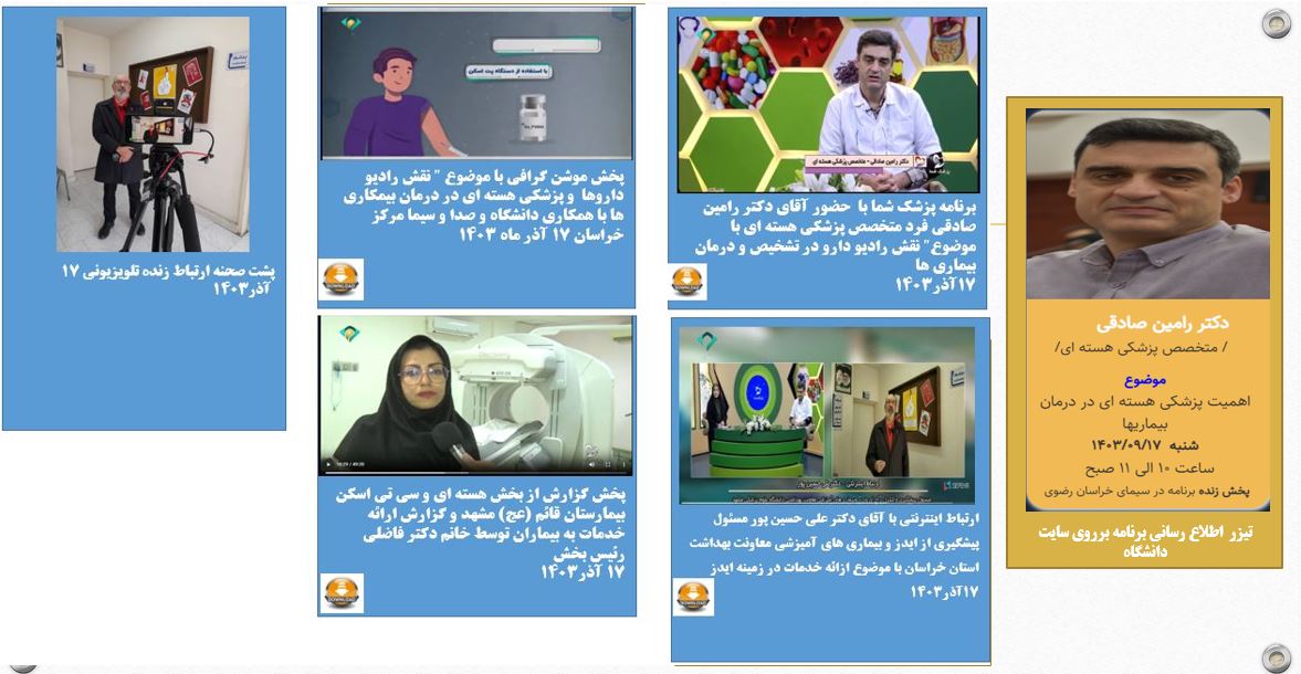 پخش موشن گرافی با موضوع " نقش رادیو داروها  و پزشکی هسته ای در درمان بیمکاری ها با همکاری دانشگاه و صدا و سیما مرکز خراسان 17 آذر ماه 1403