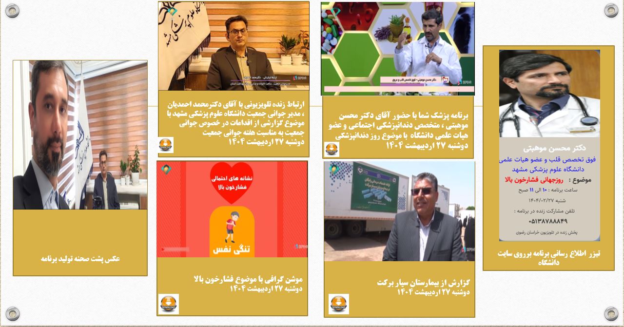 آرشیو انعکاس روزانه دانشگاه در رسانه ها پزشک شما 28 ارديبهشت 1404 بازدید: 67 امتیاز: ( 1 Rating ) پزشک شما با موضوع "فشار خون"-میهمان برنامه دکتر محسن موهبتی فوق تخصص قلب و عروق امتیاز کاربران لطفا رای دهید رای 1 رای 2 رای 3 رای 4 رای 5 پزشک شما با موضوع "فشار خون"-میهمان برنامه دکتر محسن موهبتی فوق تخصص قلب و عروق موضوع برنامه : پزشک شما با موضوع "فشار خون"-میهمان برنامه دکتر محسن موهبتی فوق تخصص قلب و عروق ارتباط تلویزیونی دکتر محمد احمدیان مدیر جوانی جمعیت دانشگاه- در خصوص هفته جمعیت 1404 موشن گرافی 1 موشن گرافی با موضوع "فشار خون" گزارش گزارش از ارائه خدمات بیمارستان سیار برکت - دانشگاه علوم پزشکی نیشابور کاری از : روابط عمومی دانشگاه علوم پزشکی مشهد با همکاری صداوسیمای مرکز خراسان رضوی ارتباط زنده تلویزیونی با دکتر محمد احمدیان -مدیر جوانی جمعیت دانشگاه مشهد گزارش از ارائه خدمات درمانی رایگان در بیمارستان سیار برکت -شهرستان نیشابور موشن گرافی فشار خون A قبلی بعدی