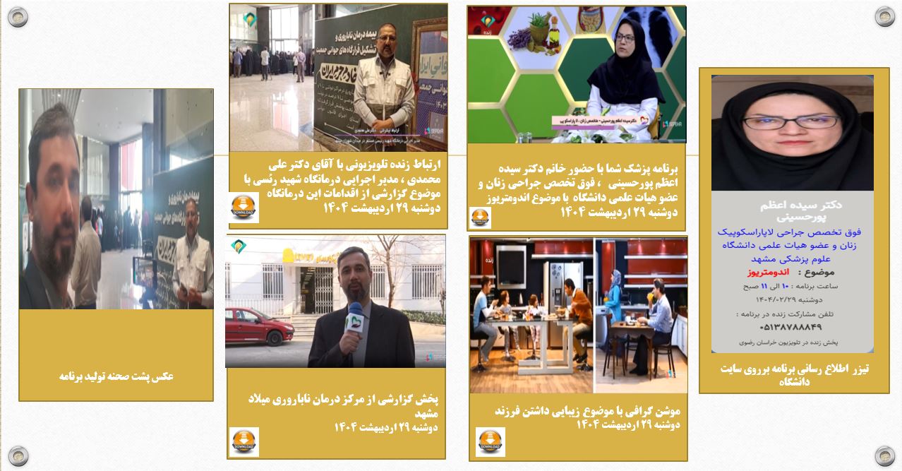 آرشیو انعکاس روزانه دانشگاه در رسانه ها پزشک شما 30 ارديبهشت 1404 بازدید: 88 امتیاز: ( 0 Rating ) برنامه پزشک شما با موضوع "آندومتریوز-میهمان برنامه خانم دکتر سیده اعظم پور حسینی متخصص زنان و لاپاراسکوپی امتیاز کاربران لطفا رای دهید رای 1 رای 2 رای 3 رای 4 رای 5 دکتر سیده اعظم پورحسینی متخصص زنان و لاپاراسکوپی-موضوع برنامه :آندومتریوز موضوع برنامه : دکتر سیده اعظم پورحسینی متخصص زنان و لاپاراسکوپی-موضوع برنامه :آندومتریوز-29 اردیبهشت ارتباط تلویزیونی ارتباط زنده تلویزیونی با دکتر علی محمدی مدیر اجرایی درمانگاه شهید رئیسی مستقر در میدان شهدای مشهد جهت ارائه خدمات رایگان پزشکی موشن گرافی 1 گزارش ارائه گزارش میدانی از مرکز ناباروری میلاد مشهد -بیمارستان امام رضا (ع)-خانم دکتر ملیحه عافیت فوق تخصص زنان و عضو هیئت علمی دانشگاه -هفته جمعیت کاری از : روابط عمومی دانشگاه علوم پزشکی مشهد با همکاری صداوسیمای مرکز خراسان رضوی ارتباط زنده تلویزیونی با دکتر علی محمدی مدیر اجرایی درمانگاه شهید رئیسی مستقر در میدان شهدای مشهد جهت ارائه خدمات رایگان پزشکی-اردیبهشت1404 ارائه گزارش میدانی از مرکز ناباروری میلاد مشهد -بیمارستان امام رضا (ع)-خانم دکتر ملیحه عافیت فوق تخصص زنان و عضو هیئت علمی دانشگاه -هفته جمعیت موشن گرافی فشار خون A قبلی بعدی