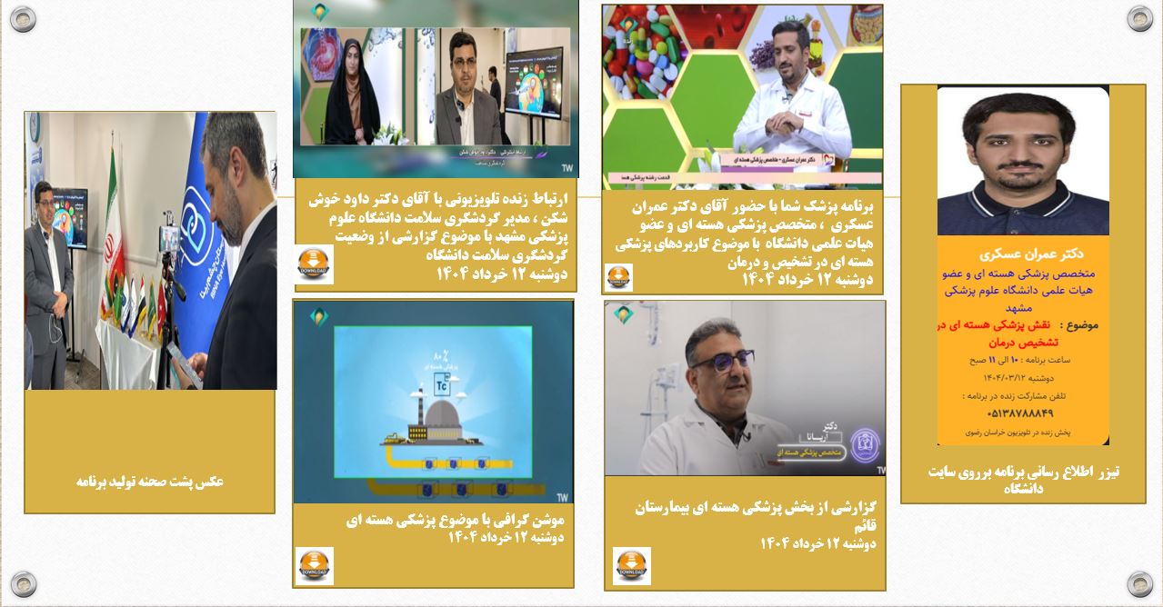 آرشیو انعکاس روزانه دانشگاه در رسانه ها پزشک شما 12 خرداد 1404 بازدید: 65 امتیاز: ( 0 Rating ) پزشک شما با موضوع "نقش پزشکی هسته ای در تشخیص و درمان بیماری ها-میهمان برنامه دکتر عمران عسکری متخصص پزشکی هسته ای امتیاز کاربران لطفا رای دهید رای 1 رای 2 رای 3 رای 4 رای 5 دکتر عمران عسکری -متخصص پزشکی هسته ای -نقش پزشکی هسته ای در تشخیص بیماری-12 خرداد موضوع برنامه : دکتر عمران عسکری -متخصص پزشکی هسته ای -نقش پزشکی هسته ای در تشخیص بیماری-12 خرداد ارتباط تلویزیونی برقراری ارتباط زنده با دکتر داود خوش شکن -مدیر گردشگری سلامت دانشگاه-12 خرداد 1404 موشن گرافی 1 گزارش کاری از : روابط عمومی دانشگاه علوم پزشکی مشهد با همکاری صداوسیمای مرکز خراسان رضوی برقراری ارتباط زنده با دکتر داود خوش شکن -مدیر گردشگری سلامت دانشگاه-12 خرداد1404 گفتگو با دکتر آریانا متخصص پزشکی هسته ای - بیمارستان قائم (عج) مشهد موشن گرافی نقش پزشکی هسته ای در کاهش و درمان سرطان ها A قبلی بعدی