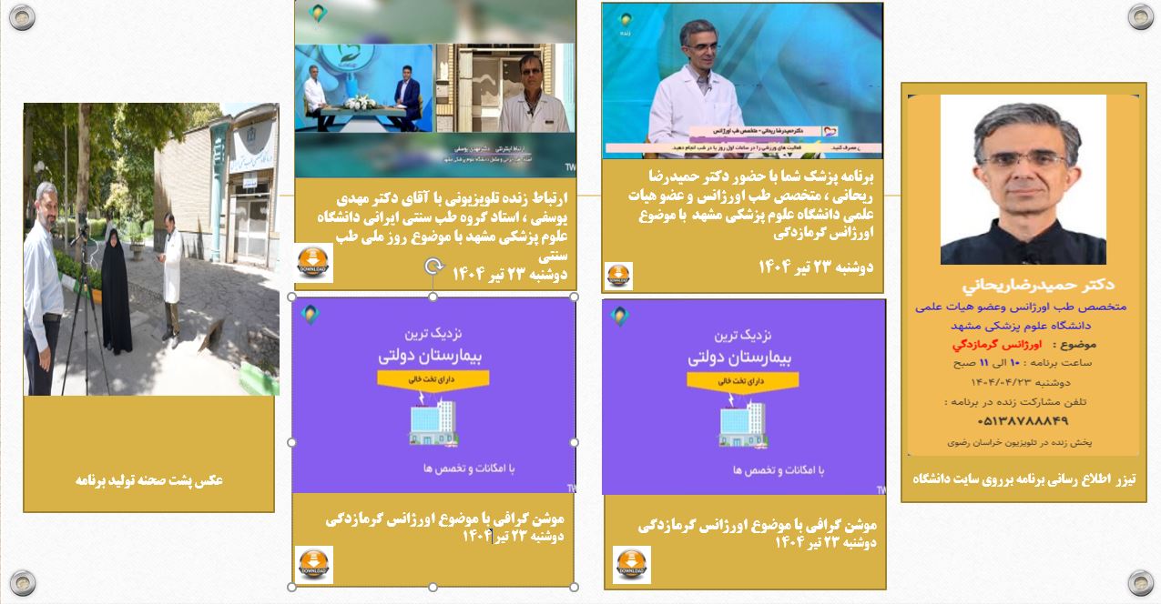 آرشیو انعکاس روزانه دانشگاه در رسانه ها پزشک شما 23 تیر 1404 بازدید: 45 امتیاز: ( 0 Rating ) برنامه دکتر حمید رضا ریحانی متخصص طب اورژانس دانشگاه علوم پزشکی مشهد-موضوع گرمازدگی امتیاز کاربران لطفا رای دهید رای 1 رای 2 رای 3 رای 4 رای 5 دکتر حمید رضا ریحانی متخصص طب اورژانس-موضوع برنامه" گرمازدگی" موضوع برنامه : دکتر حمید رضا ریحانی متخصص طب اورژانس-موضوع برنامه" گرمازدگی" ارتباط تلویزیونی ارتباط زنده تلویزیونی با دکتر مهدی یوسفی-استاد طب ایرانی و مکمل دانشگاه مشهد موشن گرافی 1 موشن گرافی نحوه عملکرد اورژانس 115 و اقداماتی که حین انتقال بیمار انجام می دهند. گزارش موشن گرافی 2 کاری از : روابط عمومی دانشگاه علوم پزشکی مشهد با همکاری صداوسیمای مرکز خراسان رضوی رتباط زنده تلویزیونی با دکتر مهدی یوسفی-استاد طب ایرانی و مکمل دانشگاه مشهد-هفته طب ایرانی -25 تیر1404 موشن گرافی نحوه عملکرد اورژانس 115 و اقداماتی که حین انتقال بیمار انجام می دهند. پزش A قبلی بعدی
