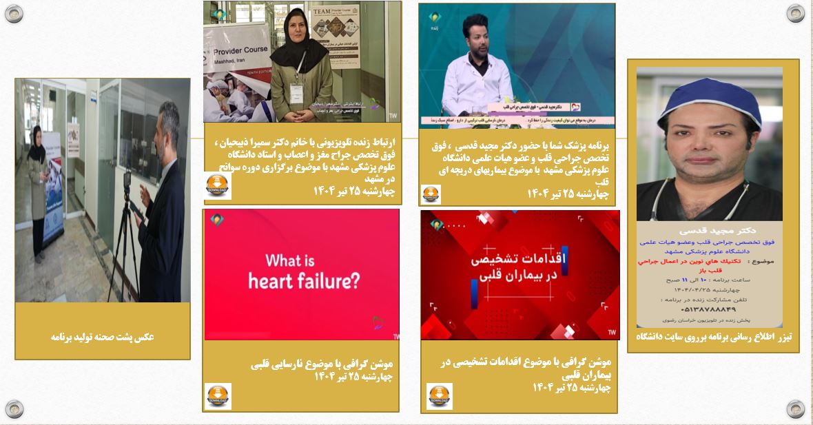 آرشیو انعکاس روزانه دانشگاه در رسانه ها پزشک شما 25 تیر 1404 بازدید: 54 امتیاز: ( 0 Rating ) برنامه پزشک شما با موضوع "بیمارهای دریچه قلب"-میهمان برنامه دکتر مجید قدسی فوق تخصص جراحی قلب امتیاز کاربران لطفا رای دهید رای 1 رای 2 رای 3 رای 4 رای 5 دکتر مجید قدوسی -فوق تخصص جراحی قلب-موضوع "بیماری های دریچه قلب موضوع برنامه : دکتر مجید قدوسی -فوق تخصص جراحی قلب-موضوع "بیماری های دریچه قلب 25 تبر1404 ارتباط تلویزیونی . ارتباط زنده تلویزیونی با خانم دکتر سمیرا ذبیحیان -فوق تخصص جراحی مغز و اعصاب برگزاری اولین دوره اقدامات حیاتی در بیماران دچار حادثه خانم دکتر سمیرا ذبیحیان فوق تخصص جراحی مغز و اعصاب و عضو هیئت موشن گرافی 1 گزارش موشن گرافی 2 کاری از : ارتباط زنده تلویزیونی با خانم دکتر سمیرا ذبیحیان -فوق تخصص جراحی مغز و اعصاب برگزاری اولین دوره اقدامات حیاتی در بیماران دچار حادثه خانم دکتر سمیرا ذبیحیان فوق تخصص جراحی مغز و اعصاب و عضو هیئت اقدامات تشخیصی در بیماران قلبی -دکتر مجید قدسی فوق تخصص جراحی قلب موشن گرافی "نارسایی قلبی"-دکتر مجید قدسی -فوق تخصص جراحی قلب موشن گرافی "راهکارهای جلوگیری از بیماری های قلب"-دکتر مجید قدسی فوق تخصص A قبلی بعدی
