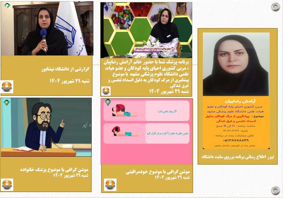 برنامه پزشک شما با حضور خانم دکتر آرامش رضاییان ، مربی کشوری احیای پایه کودکان و عضو هیات علمی دانشگاه علوم پزشکی مشهد با موضوع پیشگیری از مرگ کودکان به دلیل انسداد تنفسی و غرق شدگی