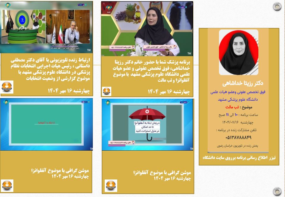 آرشیو انعکاس روزانه دانشگاه در رسانه ها پزشک شما 16 مهر 1404 بازدید: 121 امتیاز: ( 0 Rating ) برنامه پزشک شما با موضوع آنفولانزا-میهمان برنامه دکتر رزیتا خداشاهی فوق تخصص عفونی -موضوع- آنفولانزا امتیاز کاربران لطفا رای دهید رای 1 رای 2 رای 3 رای 4 رای 5 دکتر رزیتا خدا شاهی -فوق تخصص عفونی -و عضو هیئت علمی دانشگاه -موضوع آنفولانزا موضوع برنامه : دکتر رزیتا خدا شاهی -فوق تخصص عفونی -و عضو هیئت علمی دانشگاه -موضوع آنفولانزا ارتباط تلویزیونی ارتباط زنده با دکتر داستانی رئیس هیئت اجرایی نهمین انتخابات نظام پزشکی مشهد گزارش تلویزیونی موشن گرافی 2 موشن گرافی با موضوع آنفولانزا موشن گرافی 3 کاری از : ارتباط زنده با دکتر داستانی رئیس هیئت اجرایی نهمین انتخابات نظام پزشکی مشهد موشن گرافی با موضوع آنفولانزا موشن گرافی با موضوع مراقبت در زمان ابتلا به آنفولانزا A قبلی بعدی