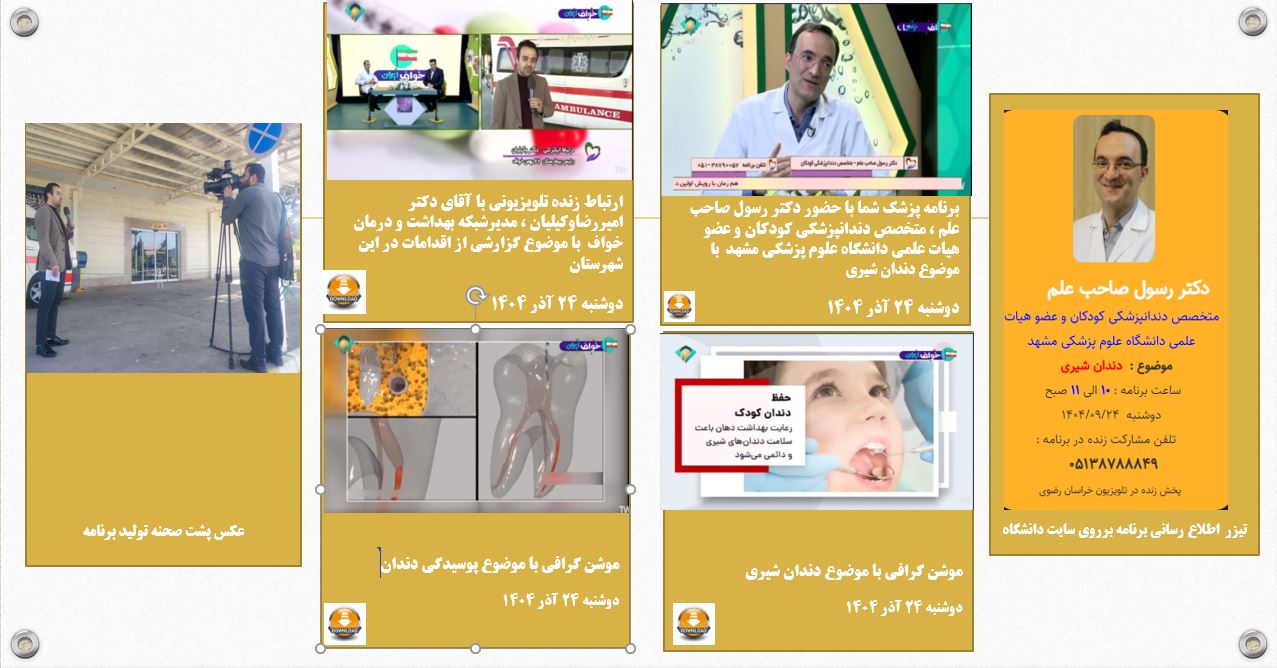 آرشیو انعکاس روزانه دانشگاه در رسانه ها پزشک شما 24 آذر 1404 بازدید: 27 امتیاز: ( 0 Rating ) برنامه پزشک شما-دکتر رسول صاحب علم متخصص داندنپزشکی کودکان -موضوع برنامه :دندان شیری امتیاز کاربران لطفا رای دهید رای 1 رای 2 رای 3 رای 4 رای 5 پزشک شما ; پزشک شما پزشک شما پزشک شما دکتر رسول صاحب علم متخصص داندنپزشکی کودکان -موضوع برنامه :دندان شیری موضوع برنامه : دکتر رسول صاحب علم متخصص داندنپزشکی کودکان -موضوع برنامه :دندان شیری ارتباط تلویزیونی ارتباط زنده با دکتر وکیلیان مدیر شبکه بهداشت و درمان خواف-خواف ایران گزارش موشن گرافی 1 موشن گرافی وظایف دندان شیری موشن گرافی 2 موشن گرافی ترمیم پوسیدگی دندان کاری از : ارتباط زنده با دکتر وکیلیان مدیر شبکه بهداشت و درمان خواف-خواف ایران موشن گرافی وظایف دندان شیری موشن گرافی ترمیم پوشیدگی دندان قبلی بعدی