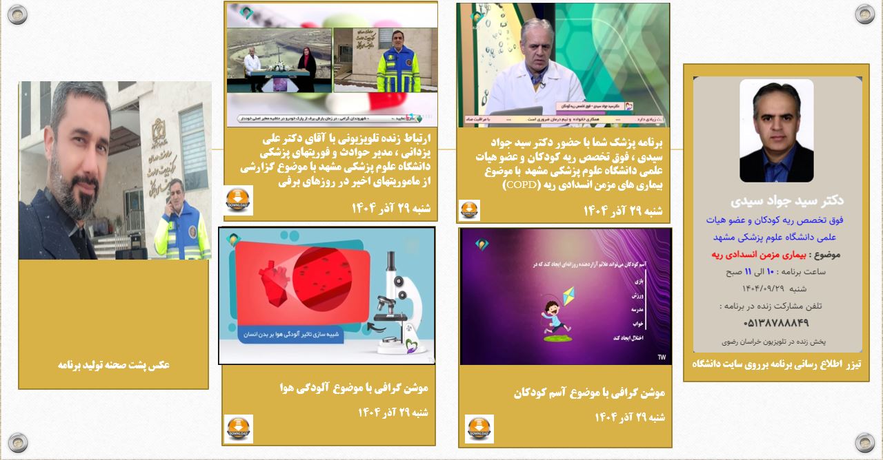 آرشیو انعکاس روزانه دانشگاه در رسانه ها پزشک شما 29 آذر 1404 بازدید: 28 امتیاز: ( 0 Rating ) دکتر سید جواد سیدی فوق تخصص ریه کودکان -با موضوع بیماری های مزمن ریه در کودکان امتیاز کاربران لطفا رای دهید رای 1 رای 2 رای 3 رای 4 رای 5 پزشک شما ; پزشک شما پزشک شما پزشک شما دکتر سید جواد سیدی فوق تخصص ریه کودکان -بیماری مزمن ریه در کودکان موضوع برنامه : دکتر سید جواد سیدی فوق تخصص ریه کودکان -بیماری مزمن ریه در کودکان ارتباط تلویزیونی ارتباط زنده با دکتر علی یزدانی رئیس اورژانس پیش بیمارستانی و 115 خراسان رضوی-آماده باش جاده ا یو ارائه خدمات با توجه به هشدار نارنجی وضعیت جوی گزارش موشن گرافی 1 موشن گرافی با موضوع آسم در دوران کودکی موشن گرافی 2 موشن گرافی با موضوع شبیه سازی آلودگی هوای بر بدن انسان کاری از : ارتباط زنده با دکتر علی یزدانی رئیس اورژانس پیش بیمارستانی و 115 خراسان رضوی-آماده باش جاده ا یو ارائه خدمات با توجه به هشدار نارنجی وضعیت جوی موشن گرافی با موضوع آسم در دوران کودکی موشن گرافی با موضوع شبیه سازی آلودگی هوای بر بدن انسان قبلی بعدی