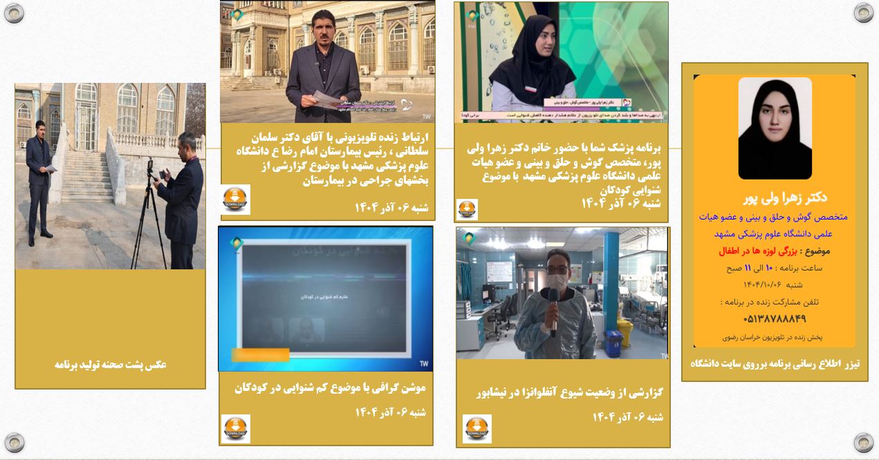 آرشیو انعکاس روزانه دانشگاه در رسانه ها پزشک شما 06 دی 1404 بازدید: 31 امتیاز: ( 0 Rating ) برنامه پزشک شما با حضور خانم دکتر زهرا ولی پور متخصص گوش و حلق و بینی و موضوع "ناشنوایی در کودکان" امتیاز کاربران لطفا رای دهید رای 1 رای 2 رای 3 رای 4 رای 5 اپزشک شما ; پزشک شما پزشک شما پزشک شما برنامه پزشک شمابا حضور دکتر زهرا ولی پورمتخصص گوش و حلق و بینی موضوع برنامه : برنامه پزشک شما با حضور خانم دکتر زهرا ولی پور متخصص گوش و حلق و بینی و موضوع "ناشنوایی در کودکان" ارتباط تلویزیونی ارتباط زنده تلویزیونی با دکتر سلمان سلطانی رئیس بیمارستان امام رضا(ع) مشهد گزارش گزارش از افزایش بیماری تنفسی (آنفولانزا و کرونا) در شهر نیشابور موشن گرافی 1 موشن گرافی با موضوع ناشنوایی در کودکان موشن گرافی 2 موشن گرافی با موضوع "لوزه" کاری از : ارتباط زنده تلویزیونی با دکتر سلمان سلطانی رئیس بیمارستان امام رضا(ع) مشهد گزارش از افزایش بیماری تنفسی (آنفولانزا و کرونا) در شهر نیشابور موشن گرافی با موضوع ناشنوایی در کودکان موشن گرافی با موضوع "لوزه" قبلی بعدی