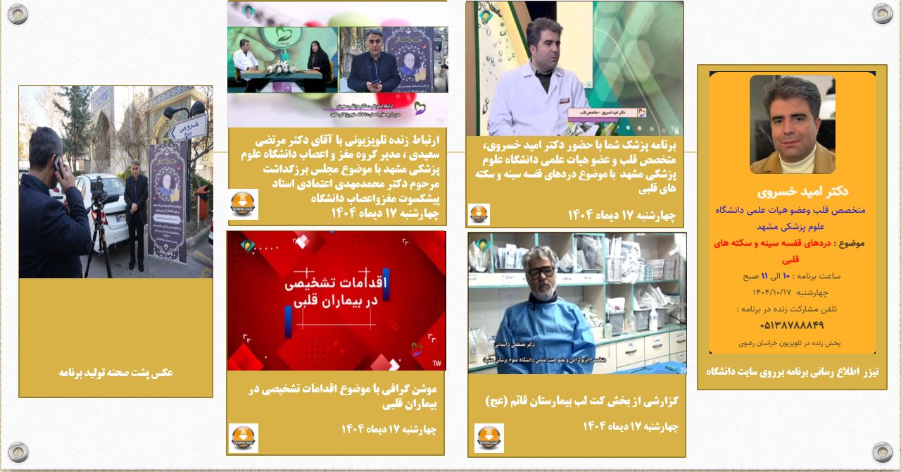 آرشیو انعکاس روزانه دانشگاه در رسانه ها پزشک شما 17 دی 1404 بازدید: 38 امتیاز: ( 0 Rating ) برنامه پزشک شما با موضوع :درمان های قفسه سینه -سکته قلبی -میهمان برنامه -دکتر امیر خسروی متخصص قلب امتیاز کاربران لطفا رای دهید رای 1 رای 2 رای 3 رای 4 رای 5 پزشک شما ; پزشک شما پزشک شما پزشک شما دکتر امیر خسروی متخصص قلب-موضوع برنامه :درمان های قفسه سینه -سکته قلبی موضوع برنامه : برنامه پزشک شما با موضوع :درمان های قفسه سینه -سکته قلبی -میهمان برنامه -دکتر امیر خسروی متخصص قلب ارتباط تلویزیونی ارتباط زنده با دکتر مرتضی سعیدی مدیر گروه بخش جراخی مغز و اعصاب مرکز پژوهشی ،آموزشی و درمانی قائم (عج) مشهد گزارش کلیپ گزارش بخش آنژیوگرافی بیمارستان قائم (عج) مشهد-دکتر مصطفی داستانی موشن گرافی 1 موشن کمک های اولیه در بیماران قلبی-سکته قلبی موشن گرافی 2 موشن گرافی با موضوع :اقدامات تشخیصی در بیماران قلبی کاری از : ارتباط زنده با دکتر مرتضی سعیدی مدیر گروه بخش جراخی مغز و اعصاب مرکز پژوهشی ،آموزشی و درمانی قائم (عج) مشهد کلیپ گزارش بخش آنژیوگرافی بیمارستان قائم (عج) مشهد-دکتر مصطفی داستانی موشن گرافی با موضوع :اقدامات تشخیصی در بیماران قلبی موشن کمک های اولیه در بیماران قلبی-سکته قلبی قبلی بعدی