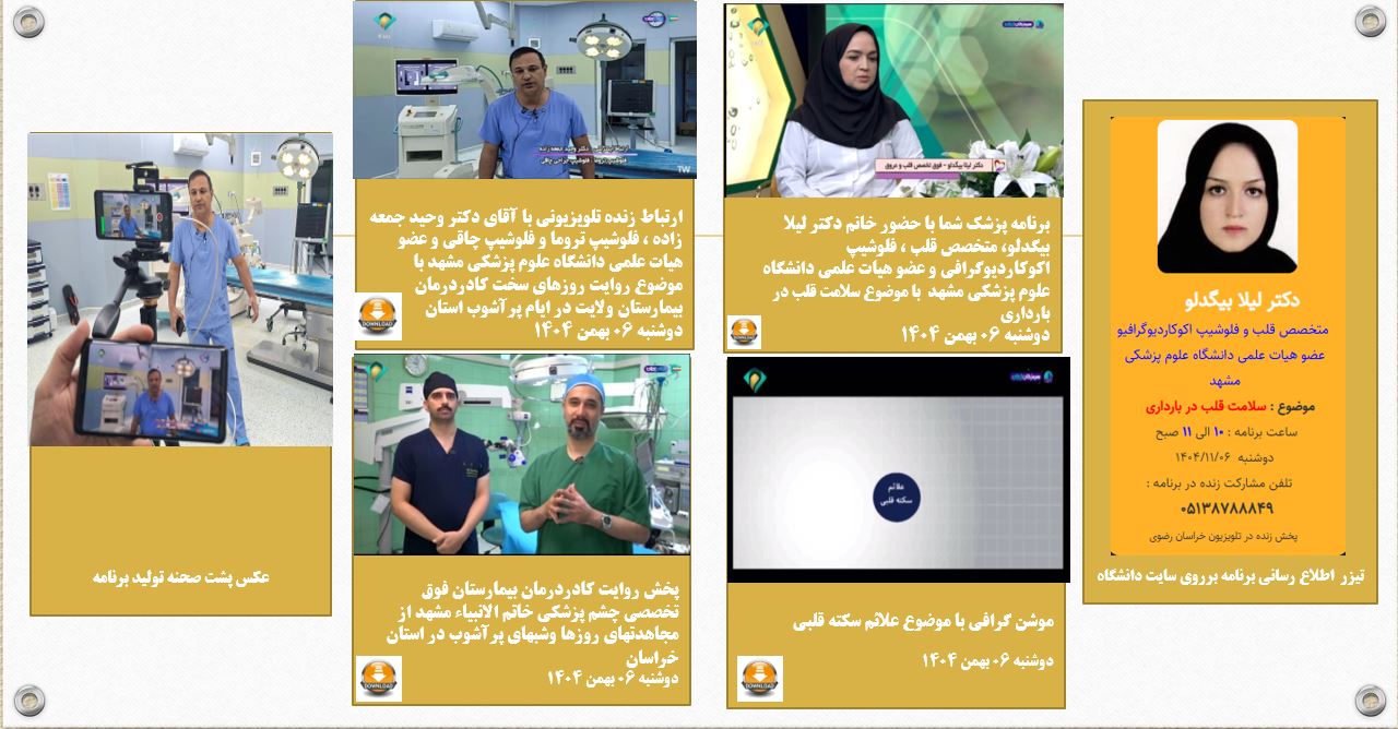 آرشیو انعکاس روزانه دانشگاه در رسانه ها پزشک شما 06 بهمن 1404 بازدید: 13 امتیاز: ( 0 Rating ) برنامه پزشک شما با موضوع سلامت قلب در باروری -میهمان برنامه دکتر لیلا بیگدلو فوق تخصص قلب و عروق امتیاز کاربران لطفا رای دهید رای 1 رای 2 رای 3 رای 4 رای 5 پزشک شما ; پزشک شما پزشک شما پزشک شما دکتر لیلا بیگدلو فوق تخصص قلب و عروق -سلامت در بارداری موضوع برنامه : دکتر لیلا بیگدلو فوق تخصص قلب و عروق -سلامت در بارداری ارتباط تلویزیونی ارتباط زنده تلویزیونی با دکتر وحید جمعه زاده فلوشیپ چاقی و فلوشیپ تروما گزارش گزارش از مجاهدت کادر درمان بیمارستان فوق تخصصی چشم پزشکی خاتم الانبیاء موشن گرافی 1 موشن گرافی علائم سکته قلبی موشن گرافی 2 موشن گرافی علائم نارسایی قلبی کاری از : ارتباط زنده تلویزیونی با دکتر وحید جمعه زاده فلوشیپ چاقی و فلوشیپ تروما موشن گرافی علائم سکته قلبی گزارش از مجاهدت کادر درمان بیمارستان فوق تخصصی چشم پزشکی خاتم الانبیاء موشن گرافی علائم نارسایی قلبی بعدی