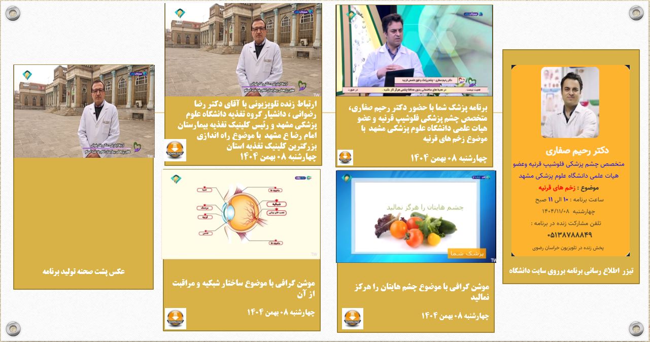 آرشیو انعکاس روزانه دانشگاه در رسانه ها پزشک شما 11 بهمن 1404 بازدید: 21 امتیاز: ( 0 Rating ) پزشک شما با موضوع زخم ها و بیماری های قرنیه -میهمان برنامه دکتر رحیم صفاری فوق تخصص قرنیه امتیاز کاربران لطفا رای دهید رای 1 رای 2 رای 3 رای 4 رای 5 پزشک پزشک شما ; پزشک شما پزشک شما پزشک شما دکتر رحیم صفاری، متخصص چشم پزشکی مشهد زخم های قرنیه موضوع برنامه : دکتر رحیم صفاری، متخصص چشم پزشکی مشهد زخم های قرنیه ارتباط تلویزیونی ارتباط زنده با دکتر رضوانی راه اندازی کلینیک مجهز تغذیه در بیمارستان امام رضا (ع) مشهد- دکتر رضا رضوانی معاون پژوهشی بیمارستان گزارش موشن گرافی 1 موشن گرافی با موضوع مراقبت از چشم موشن گرافی 2 موشن گرافی با موضوع ساختار چشم و مراقبت از آن کاری از : ارتباط زنده با دکتر رضوانی راه اندازی کلینیک مجهز تغذیه در بیمارستان امام رضا (ع) مشهد موشن گرافی با موضوع مراقبت از چشم موشن گرافی با موضوع ساختار چشم و مراقبت از آن قبلی بعدی