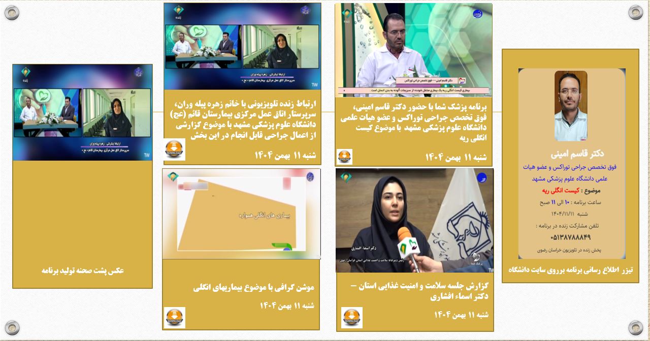 آرشیو انعکاس روزانه دانشگاه در رسانه ها پزشک شما 12 بهمن 1404 بازدید: 24 امتیاز: ( 0 Rating ) برنامه پزشک شما با موضوع بیماری های انگلی روده -مهمان برنامه دکتر قاسم امینی فوق تخصص جراحی توراکس امتیاز کاربران لطفا رای دهید رای 1 رای 2 رای 3 رای 4 رای 5 پزشک شما پزشک شما پزشک شما برنامه پزشک شما با حضور دکتر قاسم امینی فوق تخصص جراحی توراکس موضوع برنامه : برنامه پزشک شما با حضور دکتر قاسم امینی فوق تخصص جراحی توراکس -بیماری های انگلی روده ارتباط تلویزیونی ارتباط زنده با خانم زهره پیله وران سرپرستار اتاق عمل مرکزی بیمارستان قائم مشهد گزارش گزارش جلسه سلامت و امنیت غذایی استان -دکتر اسماء افشاری موشن گرافی 1 موشن گرافی 2 کاری از : گزارش جلسه سلامت و امنیت غذایی استان -دکتر اسماء افشاری ارتباط زنده با خانم زهره پیله وران سرپرستار اتاق عمل مرکزی بیمارستان قائم مشهد موشن گرافی با موضوع بیماریهای انگلی موشن گرافی با موضوع انگل های روده ای