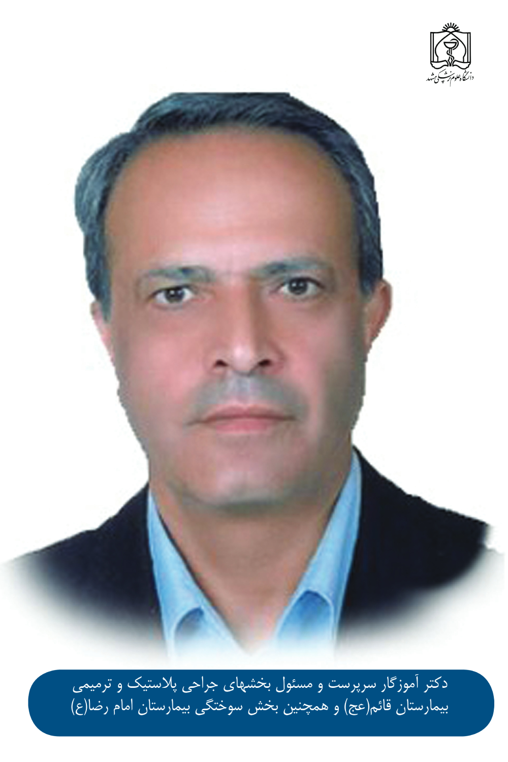 دکتر آموزگار سرپرست و مسئول بخش های جراحی پلاستیک و ترمیمی بیمارستان قائم (عج) و رییس بخش سوختگی بیمارستان امام رضا (ع)