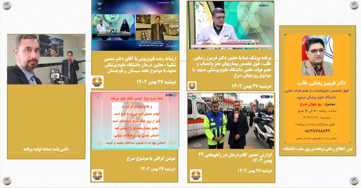 آرشیو انعکاس روزانه دانشگاه در رسانه ها پزشک شما 27 بهمن 1404 بازدید: 18 امتیاز: ( 0 Rating ) برنامه پزشک شما با حضور دکتر فریبرز رضایی طلب متخصص مغز و اعصاب-صرع امتیاز کاربران لطفا رای دهید رای 1 رای 2 رای 3 رای 4 رای 5 ; پزشک شما پزشک شما پزشک شما برنامه پزشک شما با حضور دکتر فریبرز رضایی طلب متخصص مغز و اعصاب-صرع موضوع برنامه : برنامه پزشک شما با حضور دکتر فریبرز رضایی طلب متخصص مغز و اعصاب-صرع ارتباط تلویزیونی گفتگو با دکتر منصور شکیبا معاون درمان دانشگاه مشهد و از خطه سیستان-بمناسبت هفته سیستان و بلوچستان گزارش موشن گرافی موشن گرافی با موضوع انواع صرع موشن گرافی 2 موشن گرافی با موضوع صرع کاری از : گفتگو با دکتر منصور شکیبا معاون درمان دانشگاه مشهد و از خطه سیستان-بمناسبت هفته سیستان و بلوچستان موشن گرافی با موضوع "صرع" موشن گرافی با موضوع صرع